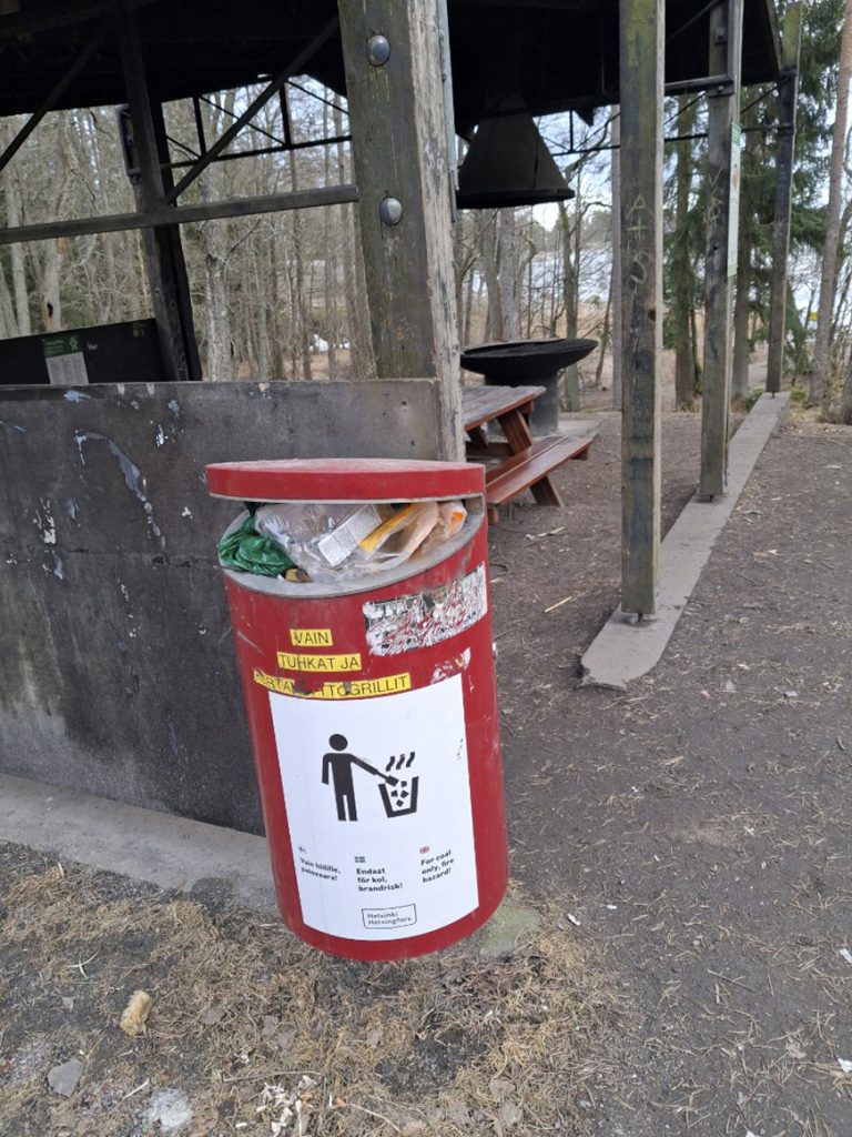Uutelassa Nuottaniemen grillikatos toissaviikolla ja viikonloppuna tämännäköinen. Roskiksia ei oltu tyhjennetty, ja myös pelkästään hiilille, tuhkalle sekä kertakäyttögrilleille tarkoitettu roskis oli täytetty muulla jätteellä.